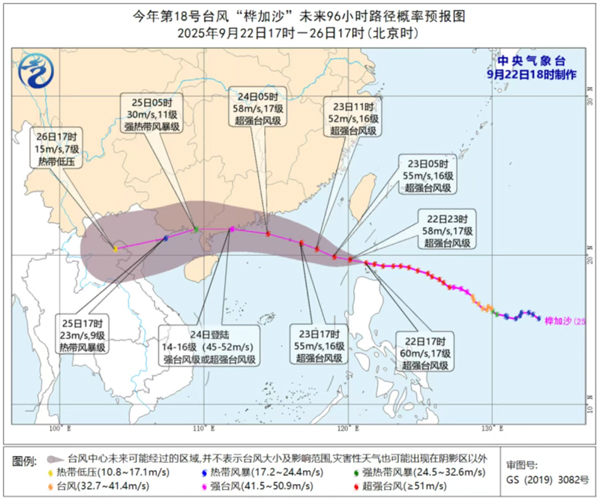 今年第 18 號(hào)臺(tái)風(fēng)“樺加沙”(超強(qiáng)臺(tái)風(fēng)級(jí))正來(lái)勢(shì)洶洶向廣東沿海逼近。截至今天 22 日 17 時(shí),“樺加沙”中心位于廣東省陽(yáng)江市東偏南方向約 990 公里的巴士海峽海面上,中心附近最大風(fēng)力 17 級(jí)(60 米 / 秒)。中央氣象臺(tái) 22 日 18 時(shí)發(fā)布臺(tái)風(fēng)橙色預(yù)警,預(yù)計(jì)“樺加沙”將于 23 日凌晨移入南海東北部海面,24 日在廣東深圳到徐聞一帶沿海登陸(強(qiáng)臺(tái)風(fēng)級(jí)或超強(qiáng)臺(tái)風(fēng)級(jí),14 - 16 級(jí),45 - 52 米 / 秒),登陸后強(qiáng)度逐漸減弱。