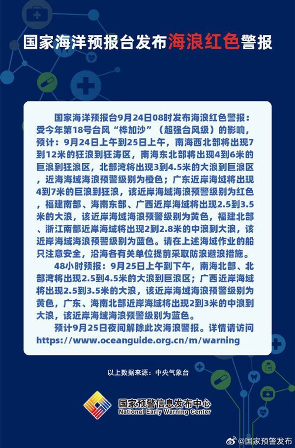 國家海洋預(yù)報臺 9 月 24 日 08 時發(fā)布海浪紅色警報:受今年第 18 號臺風 “樺加沙”(超強臺風級)的影響,預(yù)計:9 月 24 日上午到 25 日上午,南海西北部將出現(xiàn) 7 到 12 米的狂浪到狂濤區(qū),南海東北部將出現(xiàn) 4 到 6 米的巨浪到狂浪區(qū),北部灣將出現(xiàn) 3 到 4.5 米的大浪到巨浪區(qū),近海海域海浪預(yù)警級別為橙色。