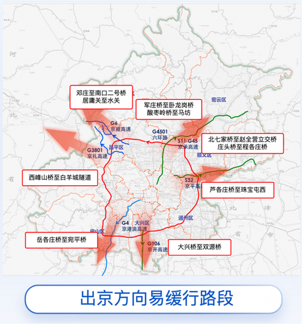 今年中秋國慶假期,北京高速公路在假期首尾呈現(xiàn)“前出后進(jìn)”潮汐流。出京高峰為9月30日下午至10月1日上午,9月30日為節(jié)前最后一個(gè)工作日,預(yù)計(jì)晚高峰提前至15時(shí),17至19時(shí)交通壓力最為突出。城區(qū)主要環(huán)路雙向及聯(lián)絡(luò)線出城方向的交通壓力顯著增加,20時(shí)后交通壓力逐步緩解。10月1日(假期首日)出京方向交通壓力大,預(yù)計(jì)全日交通量達(dá)假期峰值,其中上午8-12時(shí)高速公路出京方向交通壓力集中,9-11時(shí)最為突出。京藏、京承、京禮、京平、京港澳、京開等放射線高速公路為主力承壓通道,西六環(huán)、北六環(huán)外環(huán)路段承壓明顯。