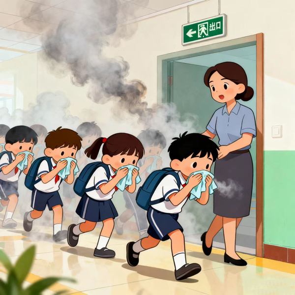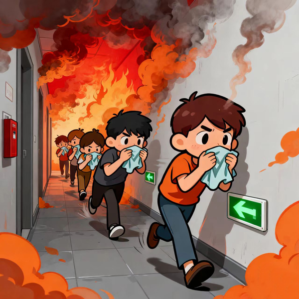 2. 快速逃生:選擇最近的安全出口,切勿乘坐電梯,用濕毛巾捂住口鼻,低姿勢前進。